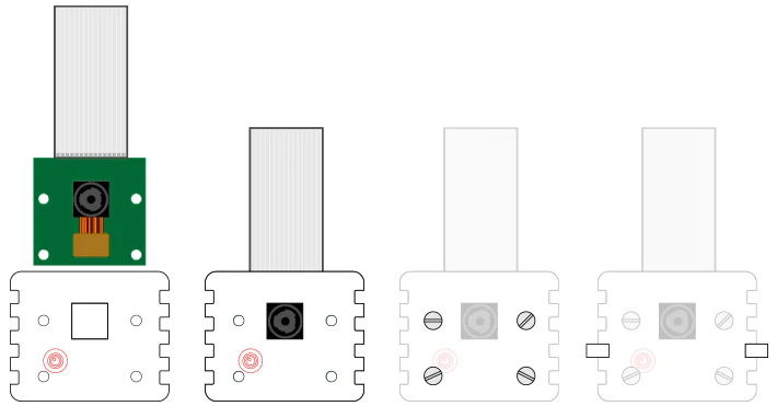 Take the large plate, and place the camera module lens into the square hole, such that the screw holes on the camera module line up with the screw holes on the plate.