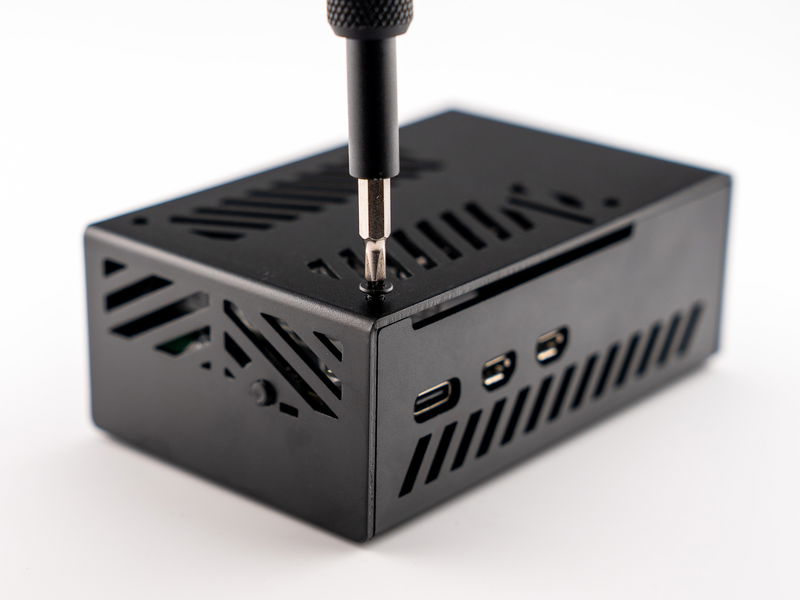 Find the USB-C and micro HDMI connectors on the side of your Pi. These stick out a little, so you'll want to insert them into the cutouts first with the Pi at an angle. Don't force it into place as this can bend your connectors - if you lift the case up so that the heads of the bolts poke out of the bottom, you should have plenty of wiggle room to manouvre the Pi safely into position on top of the standoffs.