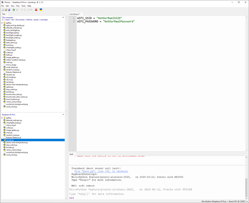 To be able to connect to your wi-fi network Presto will need to know your wireless network details - these will be stored in a file called secrets.py which should already exist on your board.