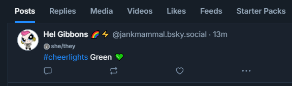 CheerLights is a global network of synchronized lights that can be controlled by anyone. You can change the colour from the Cheerlights Discord server or by including the #cheerlights hashtag in a BlueSky post, like this: