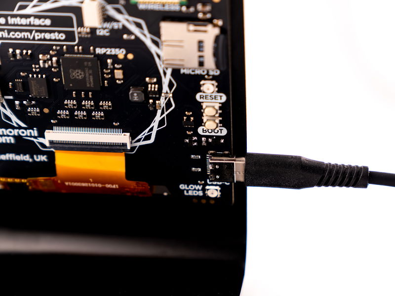 Presto is a RP2350, 4" square touchscreen built into a tidy metal stand, with some snazzy built in RGB ambient lighting. Here's how to make it do some stuff in MicroPython!