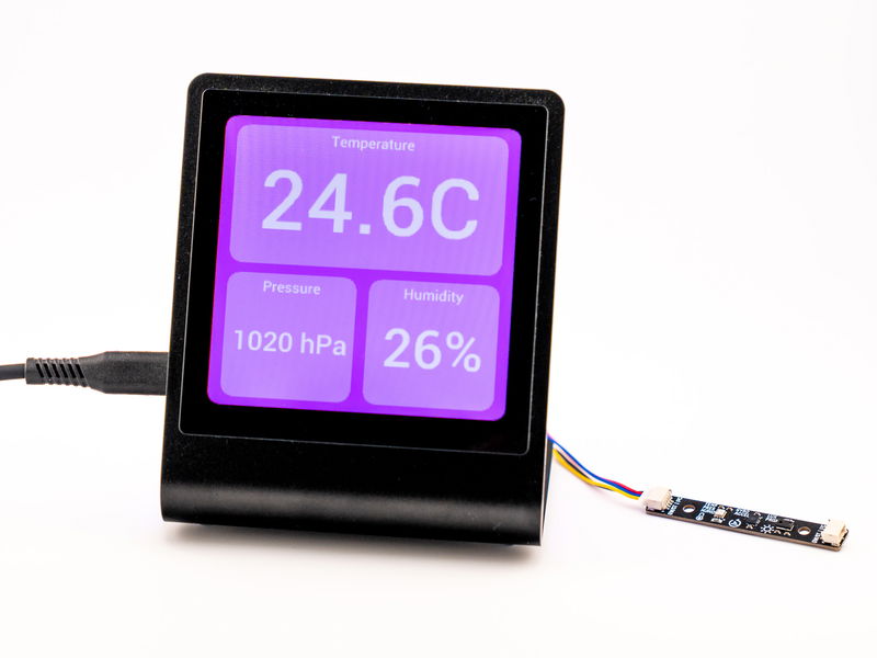 This example shows you the temperature, humidity and pressure readings from the BME280 environmental sensor on Multi-Sensor Stick. It uses a handy Widget class for displaying multiple sensor readings.