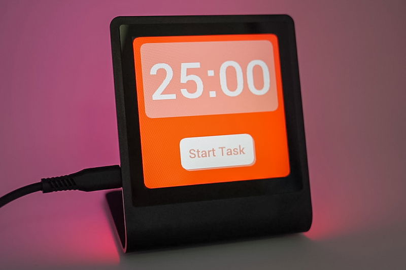 The Pomodoro technique is a time management technique that breaks work into short intervals. This example uses Presto's buzzer to alert you after each Pomodoro has finished to tell you it's time to switch focus. You can change the duration of the intervals by editing the code and changing the values under 'Time Constants' - the default is 25 minutes for a task, and 10 and 30 minutes for a short and long break.