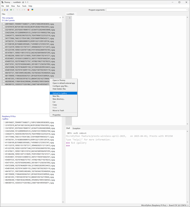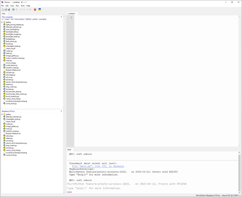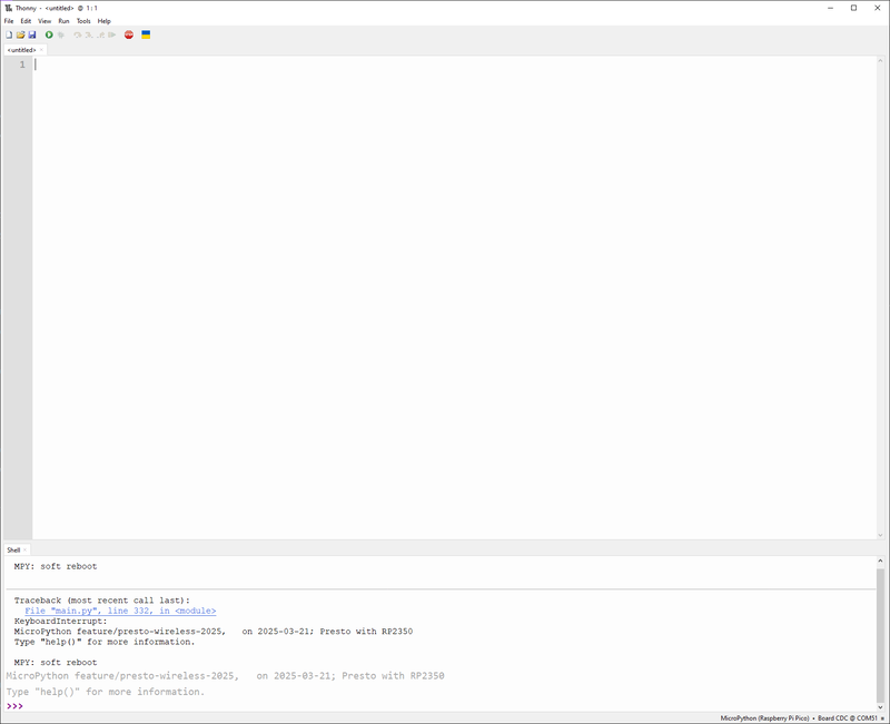 - Plug Presto into your computer, if it's not plugged in already. Because Presto is busy running the launcher program, main.py will already be running, you may need to interrupt it with the stop button in Thonny before sending it any instructions. In recent versions of Thonny, there's an option to interrupt running programs automatically - if you want to turn that on it's under Tools > Options > Interpreter > Interrupt working program on connect.